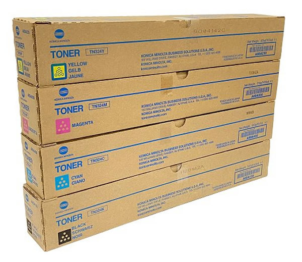 Konica Minolta TN324 (TN‑324) Complete Toner Cartridge Set includes all four genuine OEM toner cartridges (Black, Cyan, Magenta, Yellow)
