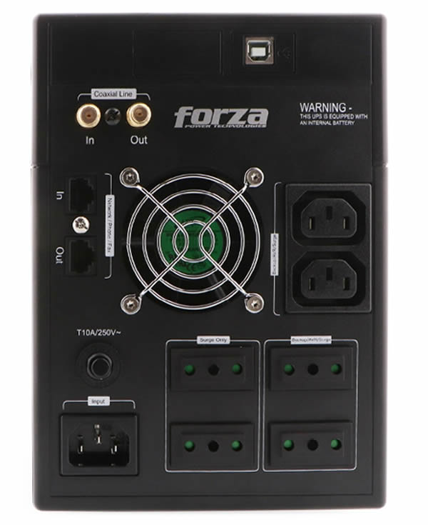 FORZA FX-1500LCD MPN: FX-1500LCD Capacidad: 1500VA/840W Topología: Interactiva Forma de onda: Onda senoidal simulada Voltaje: 120V Tipo de entrada: NEMA 5-15P Tipo de salida: 8 x NEMA 5-15R Comuni